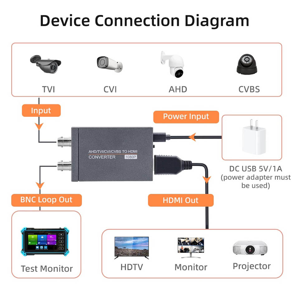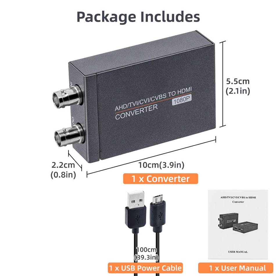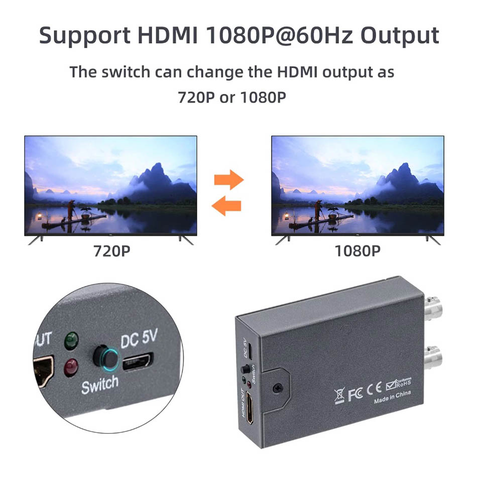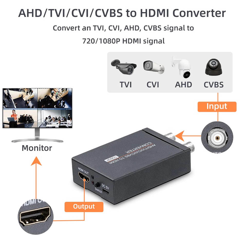 Bộ chuyển đổi tín hiệu Camera AHD TVI CVI sang HDMI 1080P 60 fps, chuyển đổi tín hiệu camera ra màn hình Tivi, máy chiếu, màn hình vi tính quan sát, theo dõi. Chuyển đổi camera sang HDMI kết hợp card capture hdmi cho mục đích hội nghị, hội họp hoặc live stream.