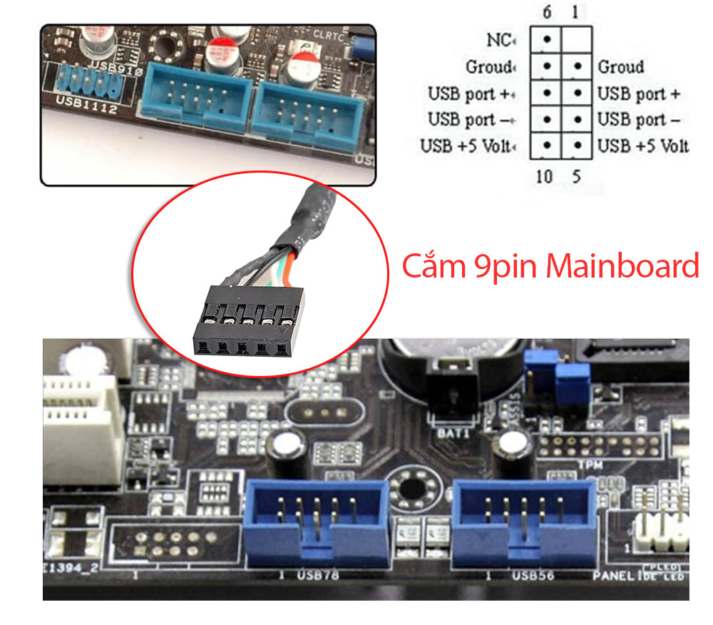 Đầu cắm main: 5pin kích thước 2.54mm (cắm 9pin trên bo mạch chủ, mainboard)